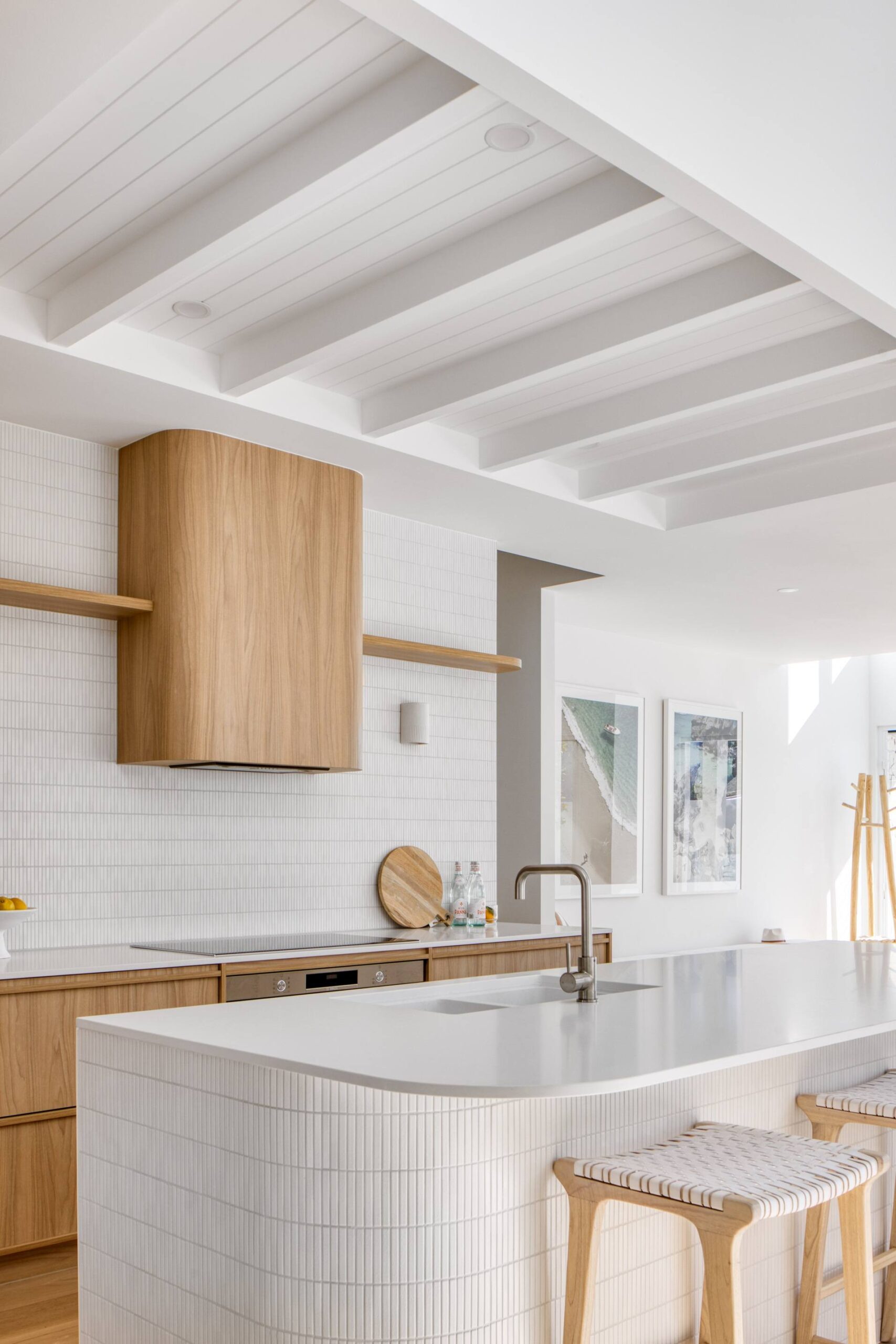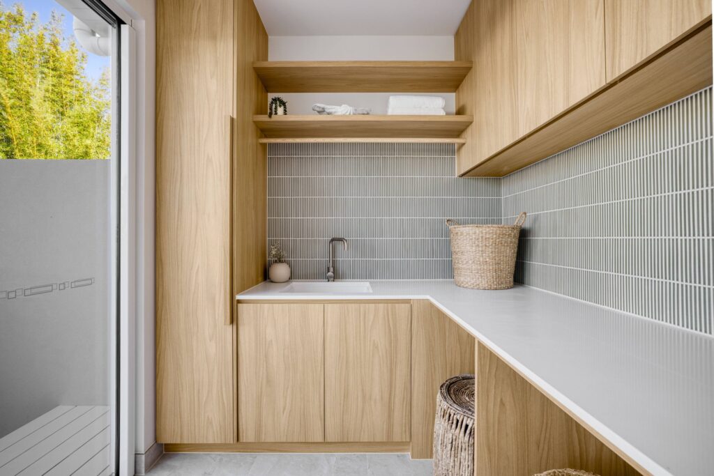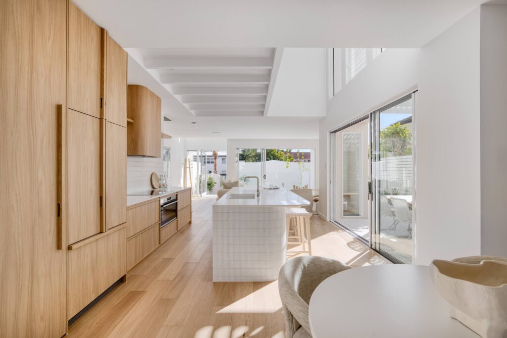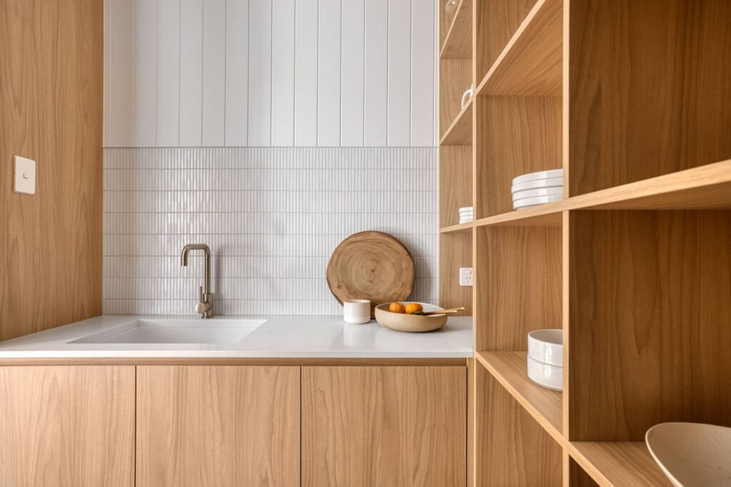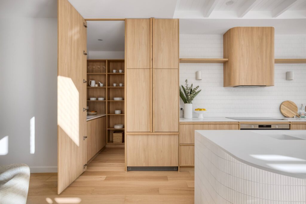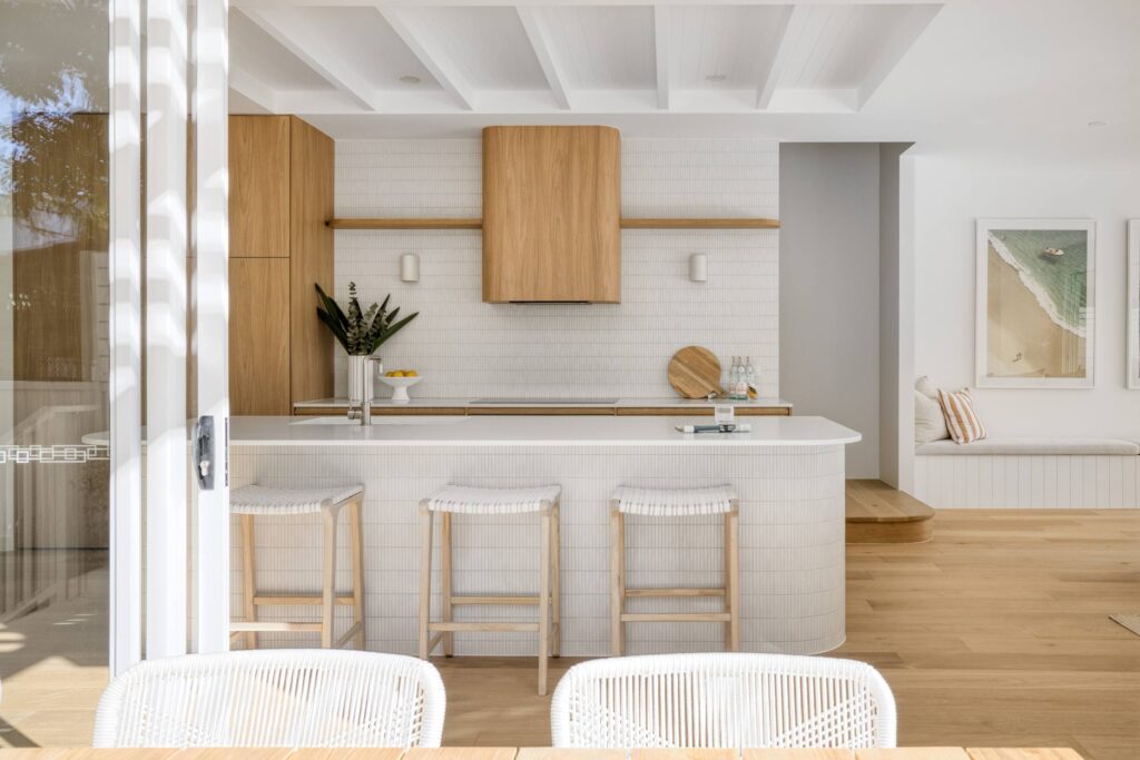 In this coastal-inspired kitchen, PureWood Naturals Matt – American White Oak Decor has been used extensively across the joinery, including doors, integrated cabinetry, shelving, and the custom rangehood feature. Its warm, sandy-toned oak grain pairs beautifully with the light, airy palette, enhancing the natural coastal aesthetic. The matte finish softens the timber’s appearance, lending a calm, tactile quality that complements the stone benchtops and white tiled splashback. This choice of décor brings a refined balance of warmth and freshness, perfectly suited to relaxed, contemporary coastal living.