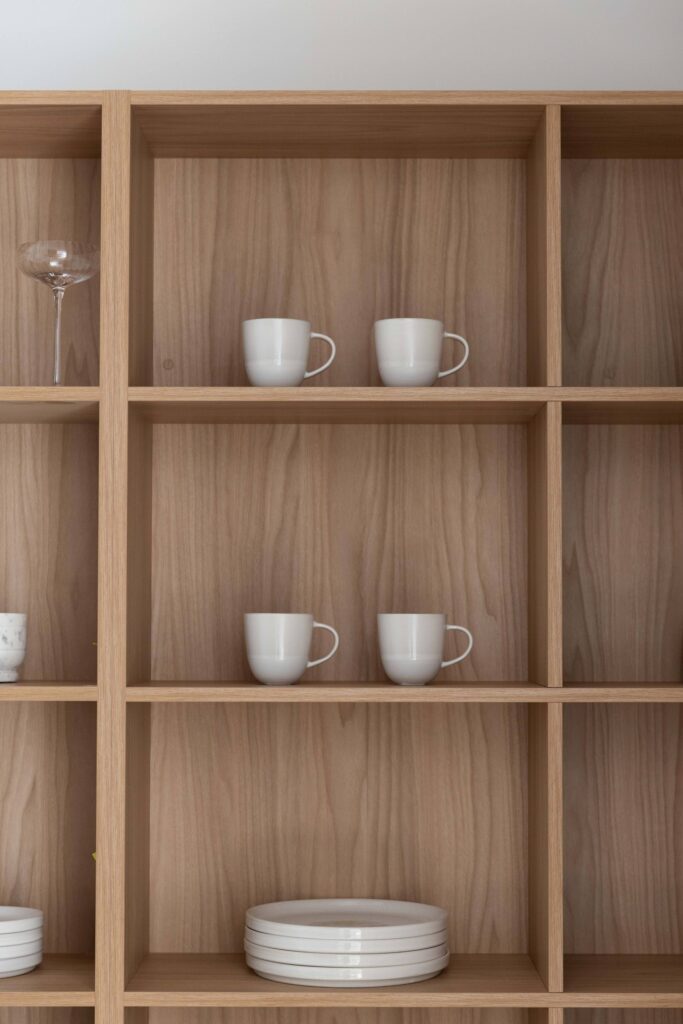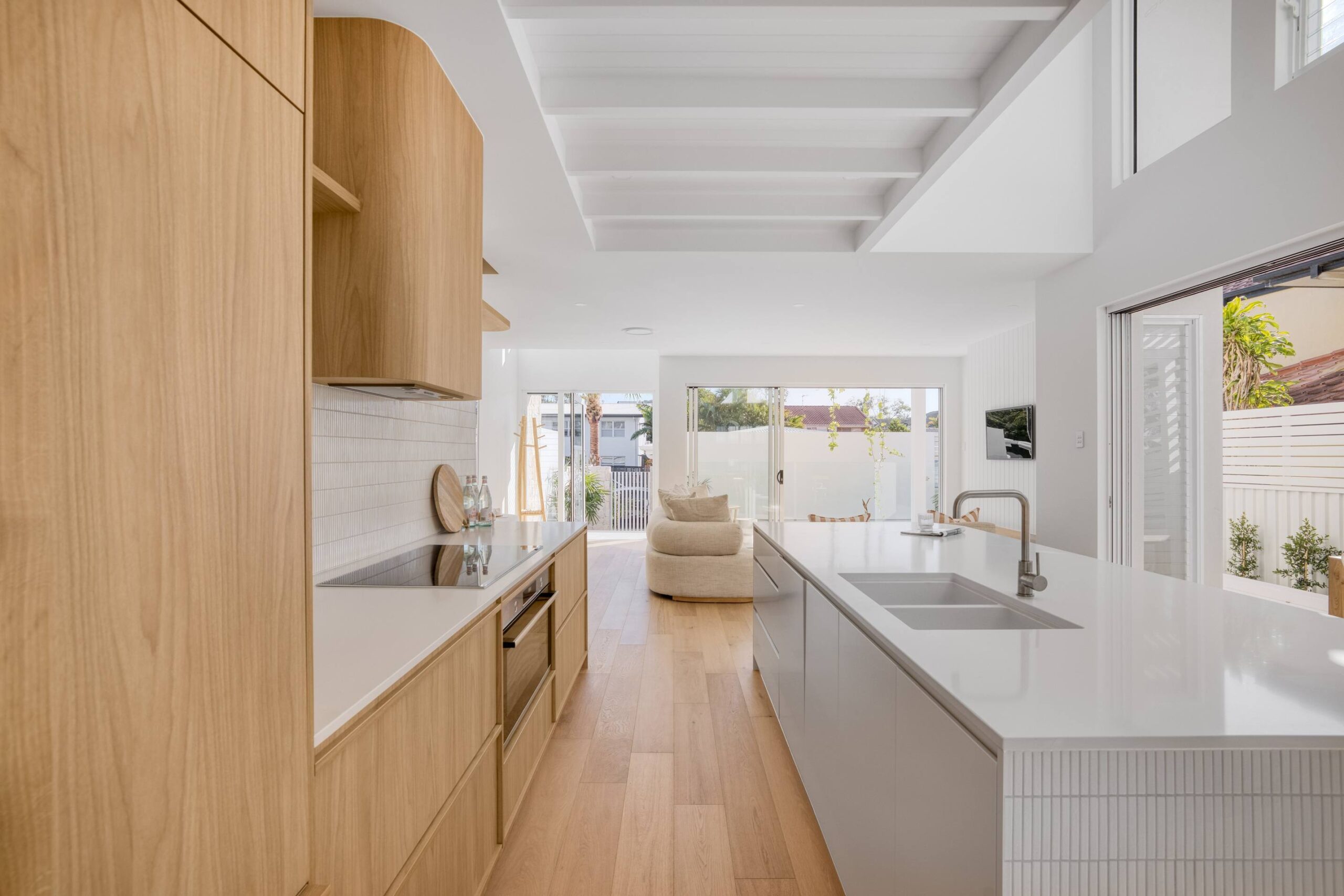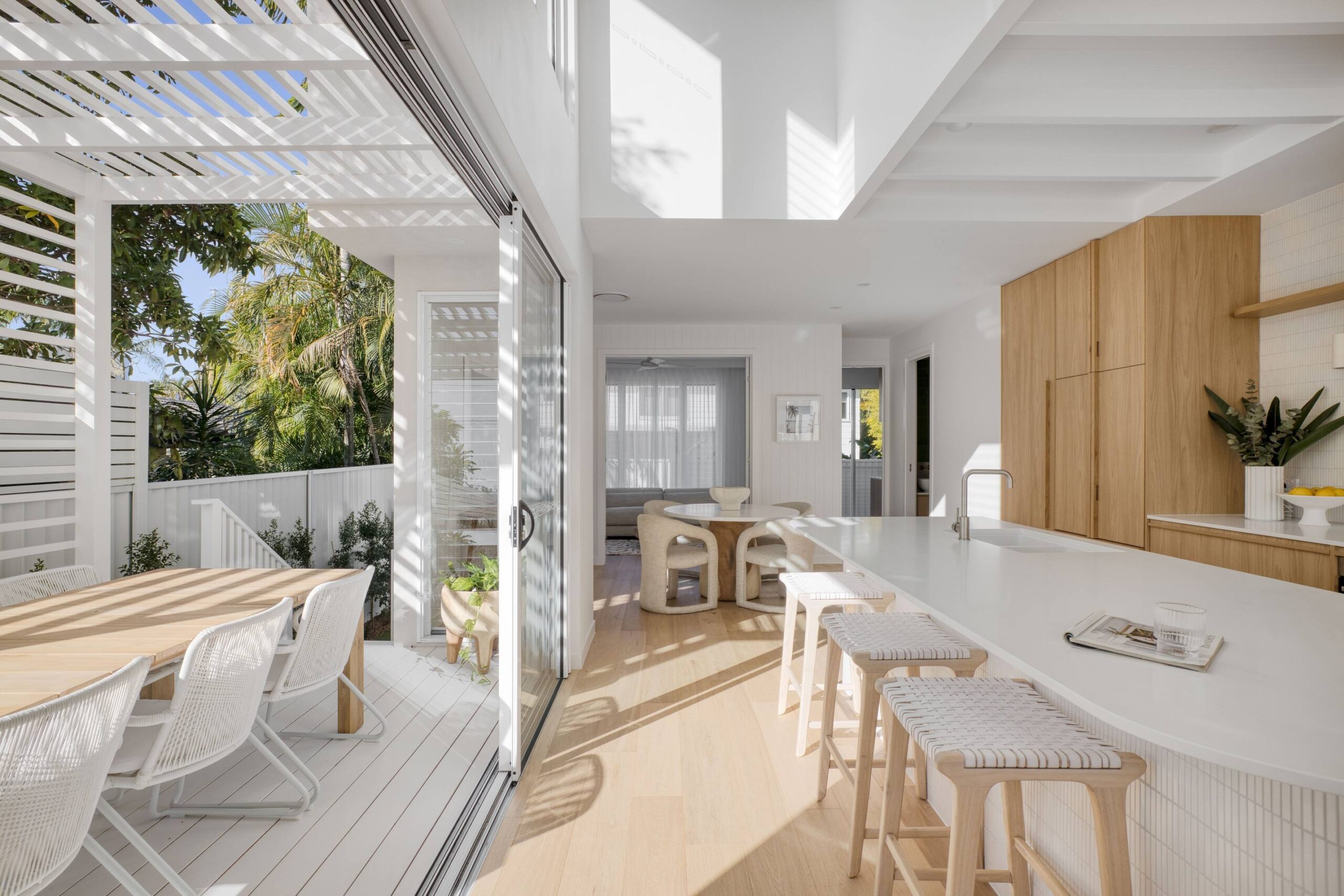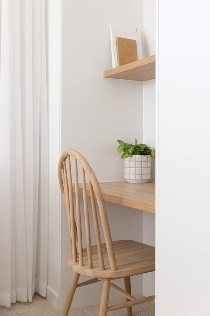 In this coastal-inspired kitchen, PureWood Naturals Matt – American White Oak Decor has been used extensively across the joinery, including doors, integrated cabinetry, shelving, and the custom rangehood feature. Its warm, sandy-toned oak grain pairs beautifully with the light, airy palette, enhancing the natural coastal aesthetic. The matte finish softens the timber’s appearance, lending a calm, tactile quality that complements the stone benchtops and white tiled splashback. This choice of décor brings a refined balance of warmth and freshness, perfectly suited to relaxed, contemporary coastal living.