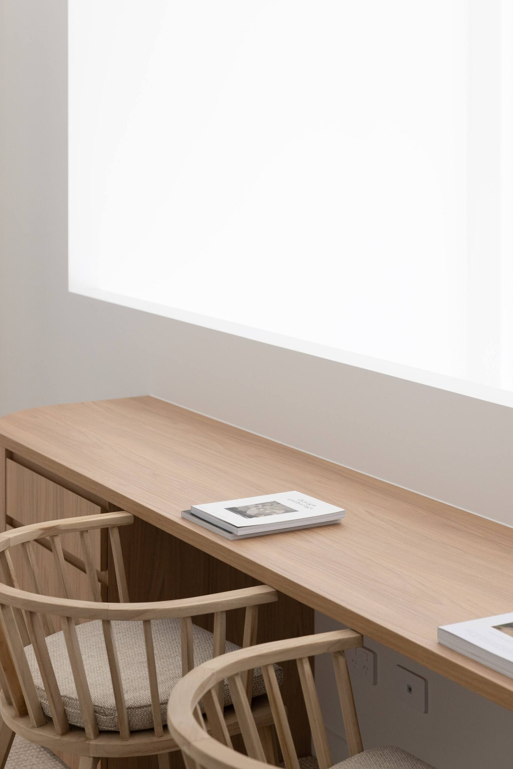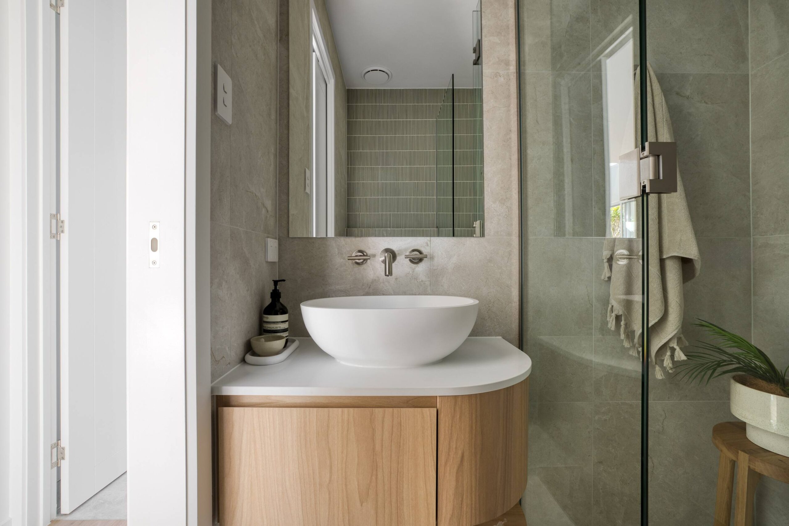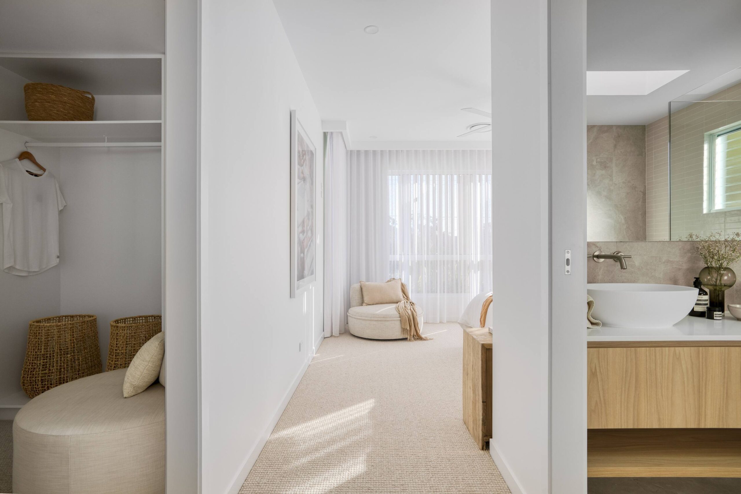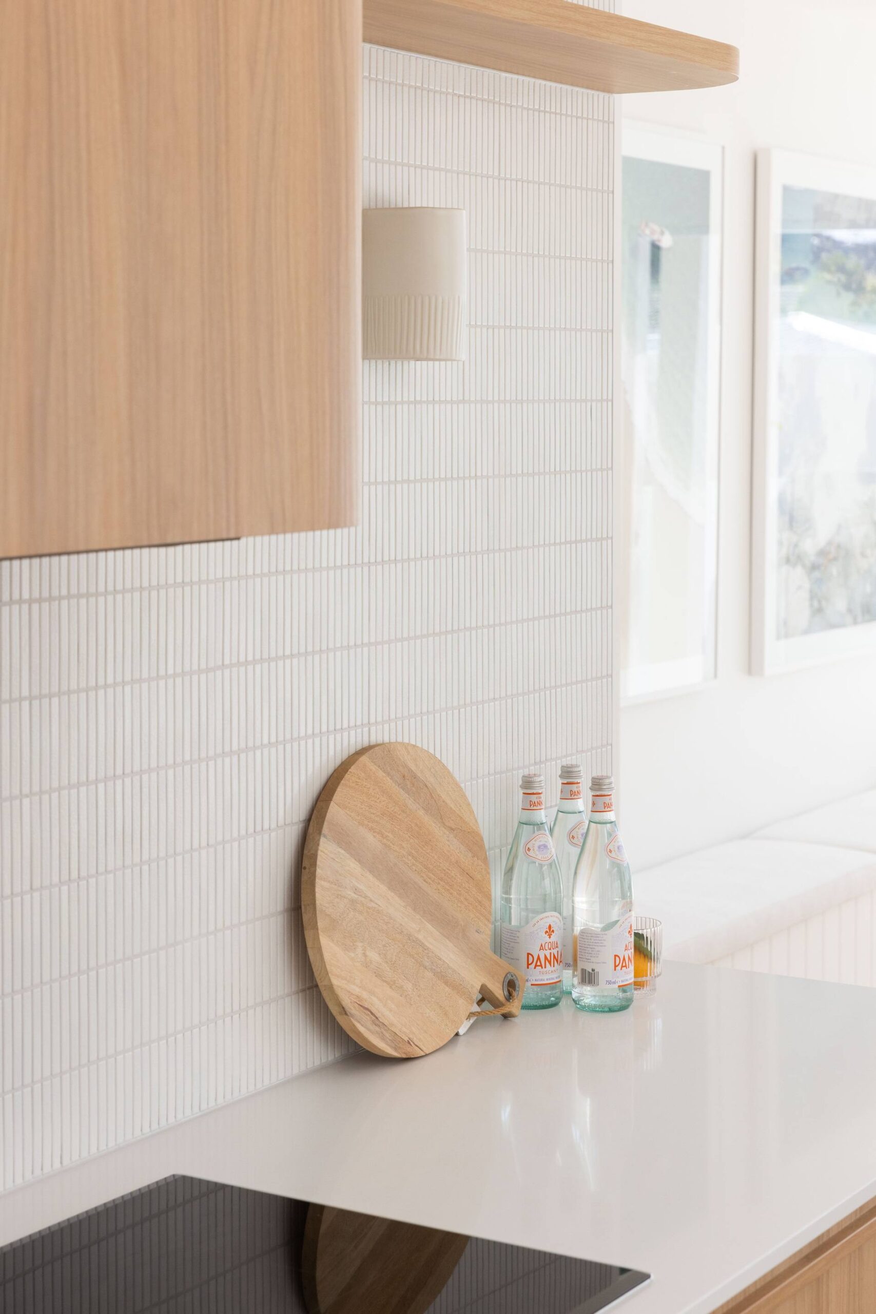 In this coastal-inspired kitchen, PureWood Naturals Matt – American White Oak Decor has been used extensively across the joinery, including doors, integrated cabinetry, shelving, and the custom rangehood feature. Its warm, sandy-toned oak grain pairs beautifully with the light, airy palette, enhancing the natural coastal aesthetic. The matte finish softens the timber’s appearance, lending a calm, tactile quality that complements the stone benchtops and white tiled splashback. This choice of décor brings a refined balance of warmth and freshness, perfectly suited to relaxed, contemporary coastal living.